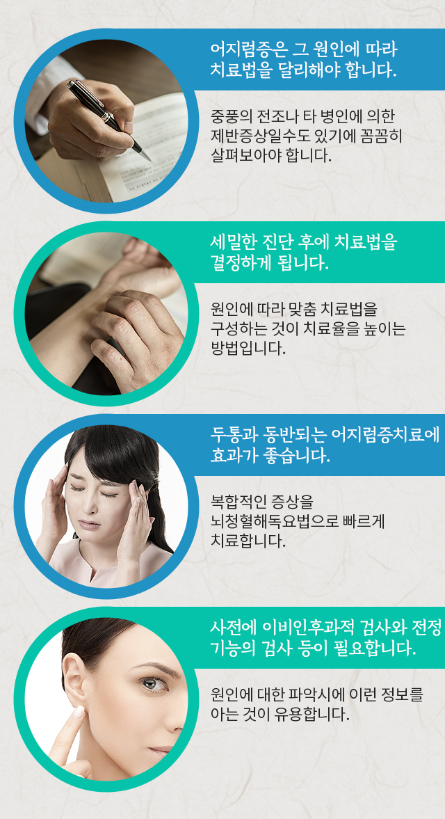뇌청혈해독요법으로 진행되는 어지럼증 치료는 치료율이 높습니다.다양한 치료법의 혼합으로 어지럼증의 복합증상까지 해결합니다.