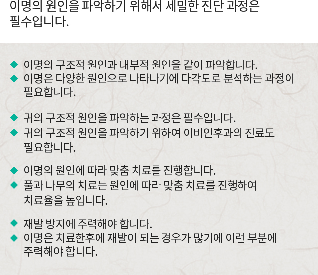 구조적인 문제와 내부적인 문제를 동시에 파악원인에 따른 맞춤 처방으로 이명을 빠르게 치료합니다.