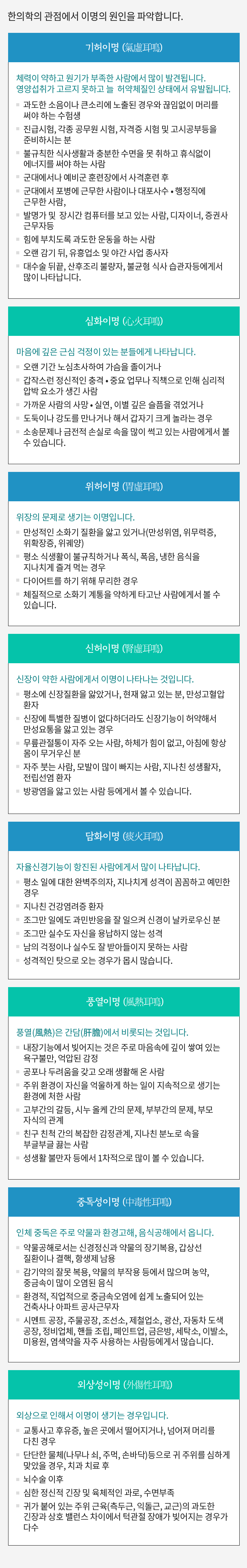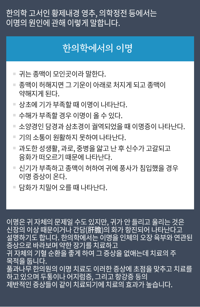 이명 > 치료 프로그램 이명 > 증상과 분류 이명 > 이명의 원인 이명 > 한의학과 이명 이명 > 이명 정보