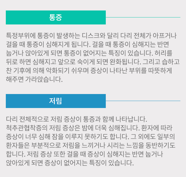 타는 것 같은 통증과 함께 다리의 감각장애와 근력저하