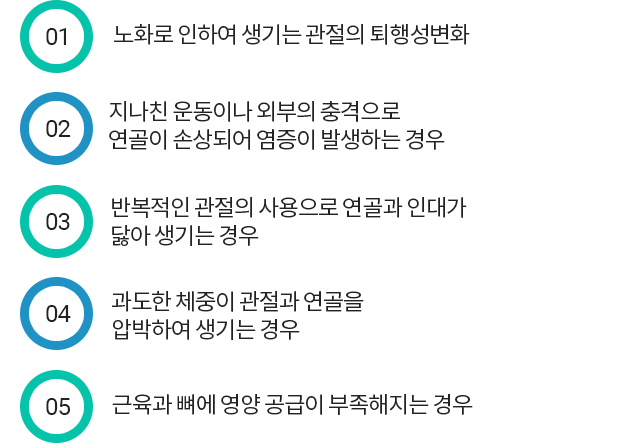 나이, 성별, 유전적 요소, 비만, 특정 관절 부위 등의