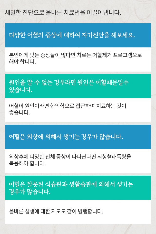 풀과나무는 어혈에 대한 세밀한 진단으로올바른 치료법을 제시합니다.