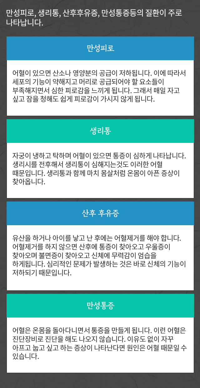 어혈클리닉 > 치료 프로그램 어혈클리닉 > 증상과 원인 어혈클리닉 > 어혈과 만성피로 어혈클리닉 > 어혈과 생리통 어혈클리닉 > 어혈과 유산후보약 어혈클리닉 > 어혈과 만성통증